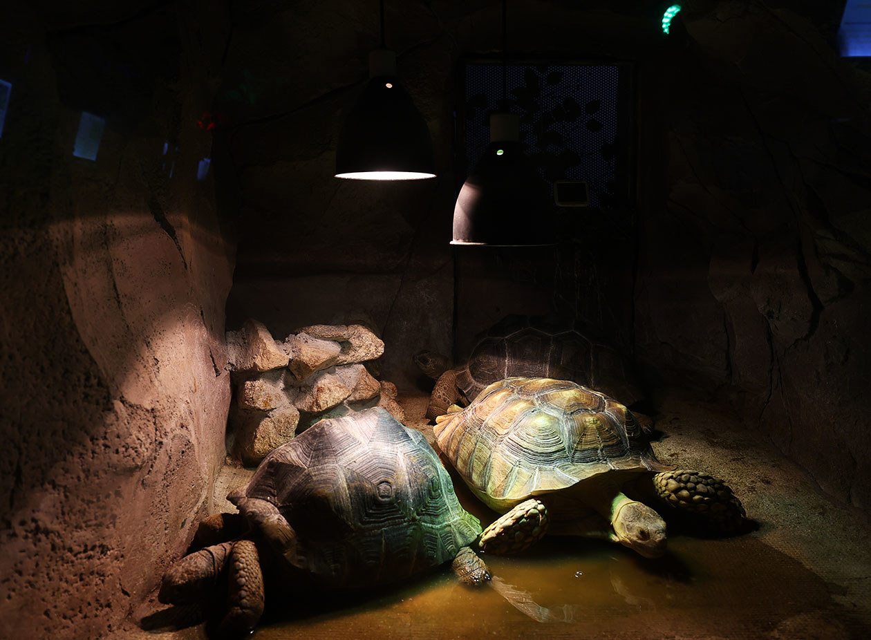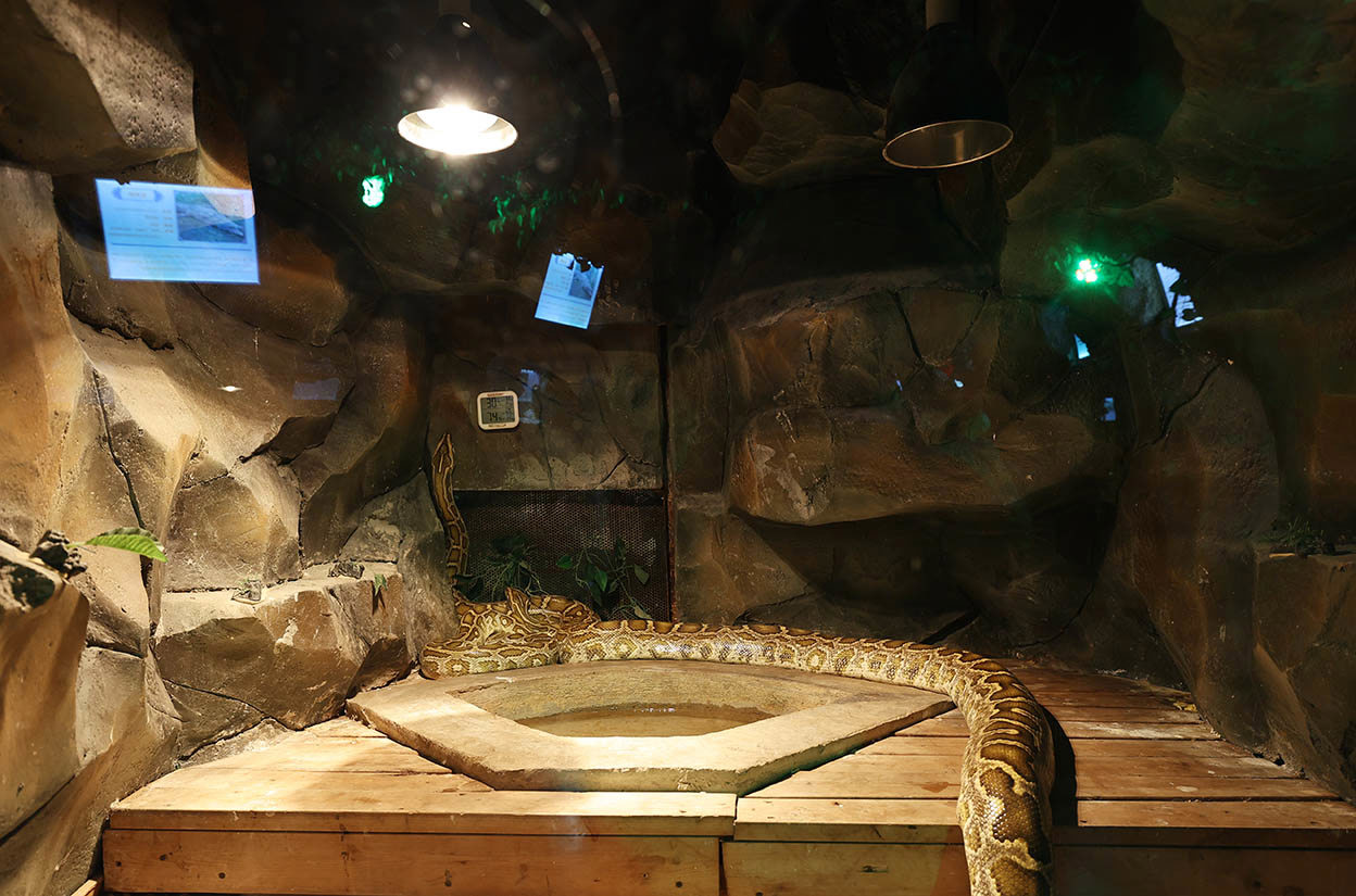 兩棲爬行類動(dòng)物們也享受著各種保暖措施帶來(lái)的溫暖。一進(jìn)館內(nèi),一股潮熱的空氣撲面而來(lái)。黃金蟒、網(wǎng)紋蟒、蜥蜴……它們居住的籠舍里,溫度計(jì)分別顯示為25℃。除了有地暖之外,還可以享受到浴霸帶來(lái)的溫暖。