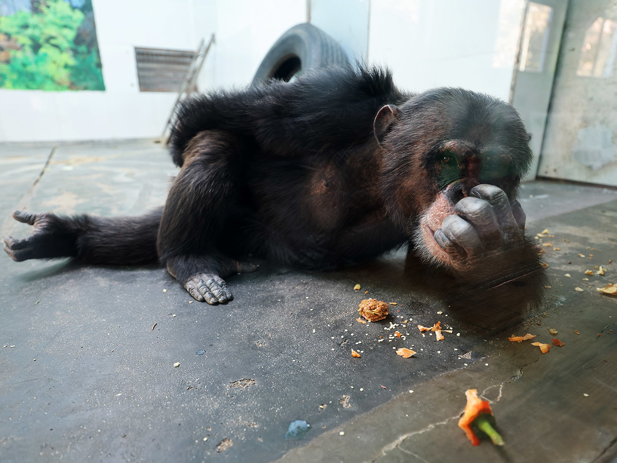 館舍里,明星動(dòng)物黑猩猩“多多”和它的“新婚妻子”珍妮,安逸地躺在地上,四肢舒展。見(jiàn)到有游客來(lái)了,鏡頭感極強(qiáng)的多多便拿起一個(gè)紅色的甜辣椒,津津有味地吃起來(lái)。夏天記者前來(lái)采訪時(shí),多多喝的是綠豆湯,這次啃食辣椒,是不是和動(dòng)物過(guò)冬有關(guān)?