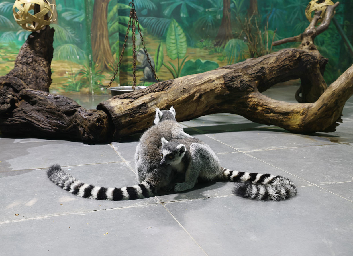 距離黑猩猩館不遠(yuǎn)處,環(huán)尾狐猴館舍里,十余只環(huán)尾狐猴們抱團(tuán)躺在地上,館舍玻璃上的露水反映出室內(nèi)室外的較大溫差。和黑猩猩一樣,這批來(lái)自馬達(dá)加斯加的小家伙們到了冬天之后,也被“請(qǐng)進(jìn)”帶有地暖的室內(nèi)館舍。這里常年保持在18—25℃,是它們?nèi)鰵g玩耍的“大暖房”。