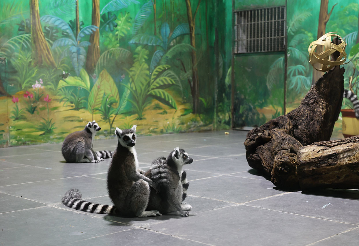 動(dòng)物管理部猴苑班長(zhǎng)李艷玲介紹,為了讓環(huán)尾狐猴生活得更加快樂(lè),他們將室外的豐容設(shè)施搬到了室內(nèi),取食器、輪胎、竹子編制的小球等,最大限度地還原它們?cè)谑彝獾纳姝h(huán)境。除了環(huán)境豐容,冬天里,飼養(yǎng)員們也會(huì)制造一些食物豐容,比如將食物藏在葉子下面,讓動(dòng)物們邊吃邊玩。