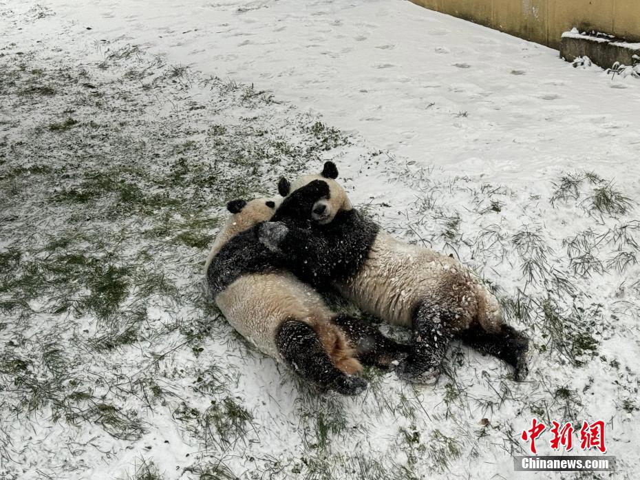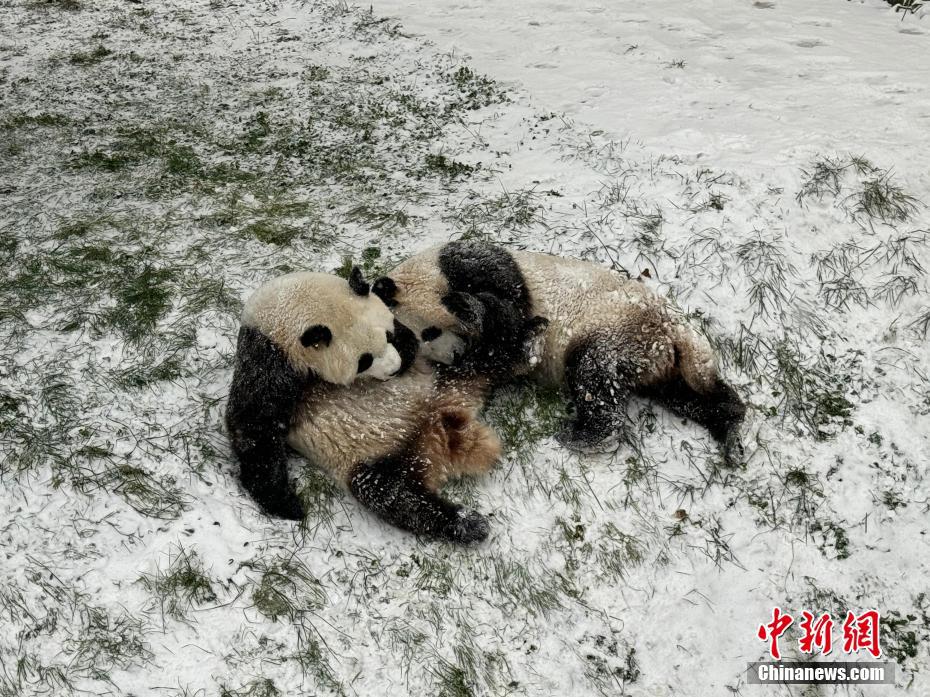 12月15日,西安迎來降雪天氣,在西安秦嶺野生動物園里,兩只憨態(tài)可掬的大熊貓來到戶外,在雪地里玩起了摔跤。時而互相追逐,時而摟抱在一起,玩得不亦樂乎。