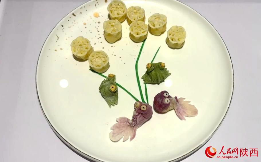 除了單獨(dú)的造型,把餃子組合起來就能制作成一幅畫,“荷塘月色”的造型分別取源于大唐芙蓉園荷塘里的金魚、蓮蓬和青蛙,既能讓客人品嘗到不同口味的餃子,同時還能了解到西安的文化。