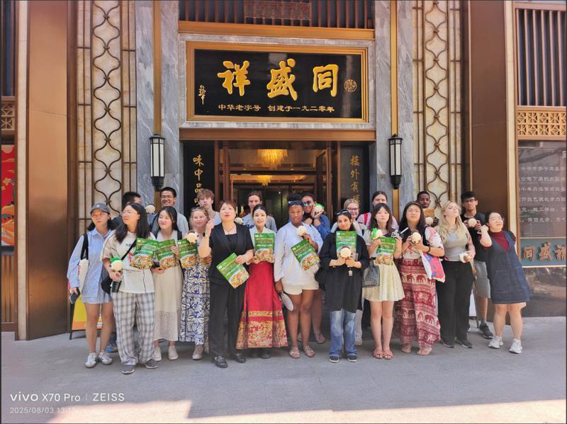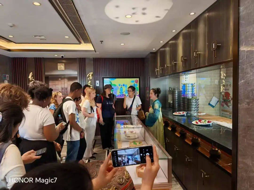 文明的深度對話,同樣在西安街頭巷尾升騰的煙火氣中熱烈展開。訪學團走進西安飯莊、德發(fā)長餃子館、同盛祥、清雅齋、西安烤鴨店等承載著城市記憶的中華老字號。在非遺大師的引導下,青年學子們親手掰開一塊塊坨坨饃,感受饃粒大小對湯汁吸收的微妙影響;嘗試捏出形態(tài)各異的花樣餃子,體驗指尖上的匠心……這不僅是味蕾的盛宴,更是理解西安生活美學、感悟中華飲食“食不厭精,膾不厭細”智慧的獨特課堂。