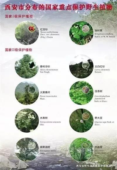 秦嶺素有“中國國家公園”及“綠色基因庫”的美譽,是中華文明的精神標識和中華地理的自然標識,是我國乃至世界都極為罕見的生物資源寶庫,蘊藏著大量珍稀野生動植物資源。其中,國家一級保護野生動物有:大熊貓、金絲猴、羚牛、朱鹮、豹、林麝等10余種;二級保護野生動物有:豺、黑熊、石貂等65種。國家一級保護植物有:紅豆杉、獨葉草等4種;二級保護植物有:連香樹、太白紅杉、大果青扦、水曲柳、香果樹、秦嶺冷杉等13種。